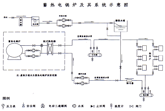 蓄熱電鍋爐配以蓄熱水箱及附屬設(shè)備即構(gòu)成蓄熱式電鍋爐系統(tǒng)。在電網(wǎng)低谷時(shí)段開啟電鍋爐將水加熱并儲存在水箱中,在電網(wǎng)高峰時(shí)段關(guān)閉電鍋爐。利用蓄熱水箱中的熱水采暖,達(dá)到全部使用低谷電力(全蓄熱式)或部分使用低谷電力(半蓄熱式)供熱的目的。